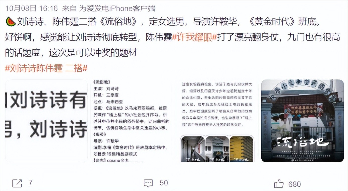 从传出的消息上看,刘诗诗即将拍摄《流俗地》,这部剧是一部现实题材电视剧,讲述的是:盲人银霞和好朋友细辉还有拉祖居住在马来西亚锡都“楼上楼”,三个人成为彼此最好的朋友,银霞长大后,成为出租车接线员,凭借超凡的记忆力,帮助议员夫妇找回失散的儿子,所以她摇身一变成为“红人”。